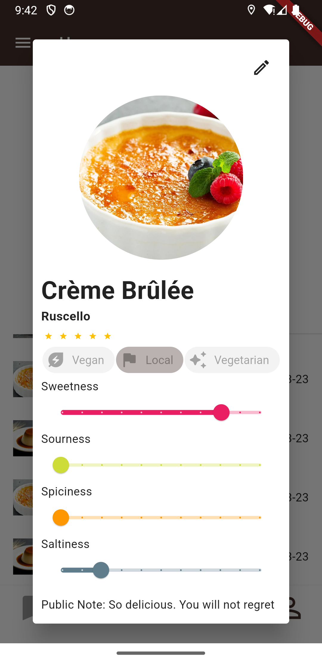 Want to look back on your ratings in a more detailed manner? Press on any of the ratings within history view and you can get all the juicy details on a dish you wrote yesterday or 5 years ago